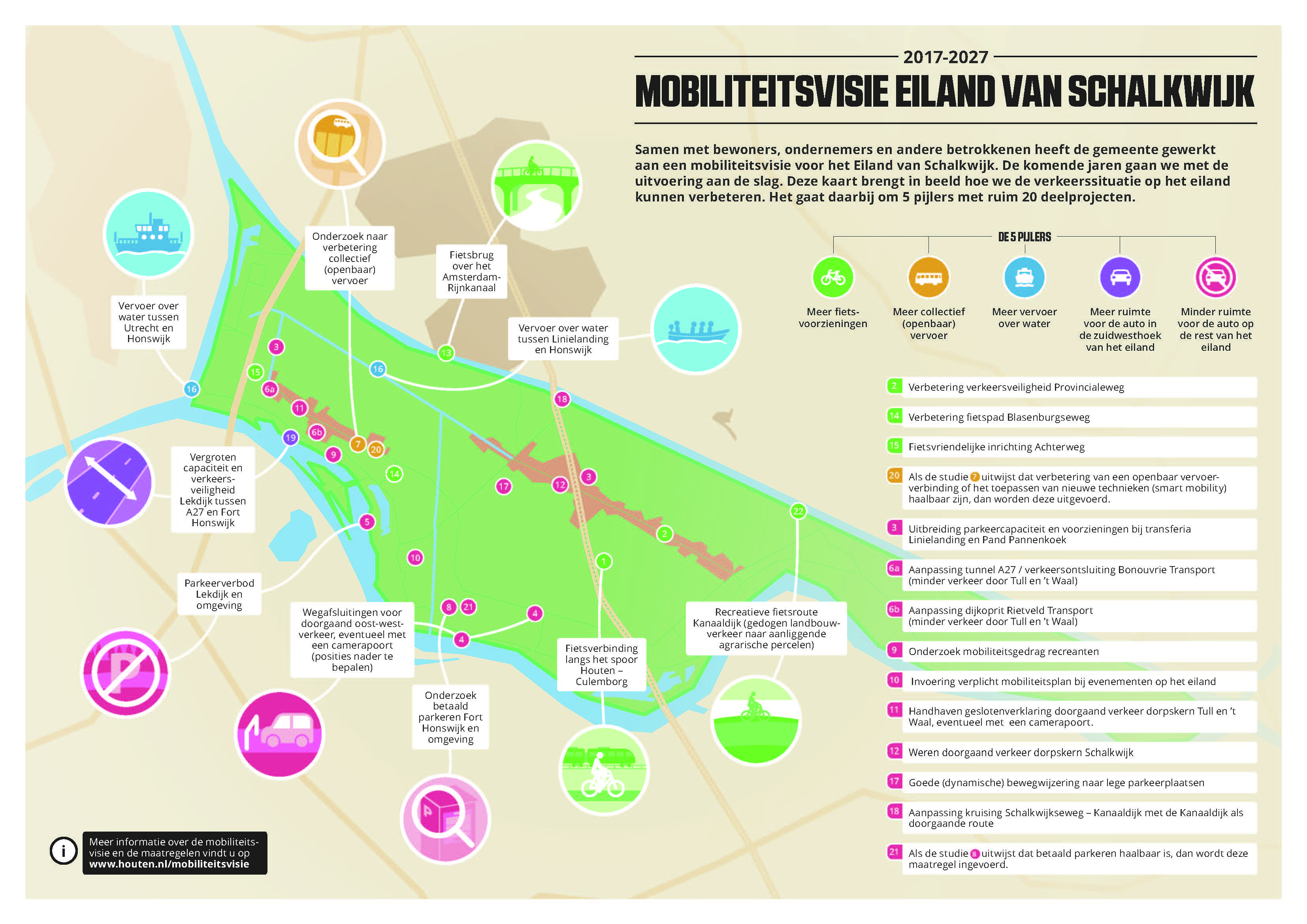 In 2017 werd de Mobiliteitsvisie Eiland van Schalkwijk 2017-2027 vastgesteld. Deze visie brengt in beeld hoe we de verkeerssituatie op het eiland de komende jaren verbeteren én hoe we ontwikkelingen mogelijk maken.
